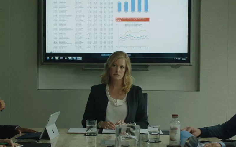 Breaking Bad’s Anna Gunn stars as Naomi Bishop, a senior investment banker, whose specialty is taking tech start-ups to their IPOs. As the film opens, Naomi is smarting over the failure of her last deal. Actually, the deal went through, just not with Naomi at the helm. She was thrown over at the last minute for another firm. Naomi is only given vague reasons for the breach of trust: She rubs some people the wrong way, she ruffles feathers, etc. Determined for her next deal to be a gigantic success that will catapult her to the head banker’s chair (her Jenga-playing boss, who tells her that it’s just not her year, is retiring), Naomi is fully committed to delivering a spectacular IPO for her next client, the online security company Cachet. Gunn is a brilliant choice to play Naomi, bringing a mixture of human vulnerability and experienced business acumen to the task. The widely noted vitriolic response that was directed toward Gunn for defying expected gender roles while playing Skyler on Breaking Bad lends extra depth to her portrayal of Naomi.