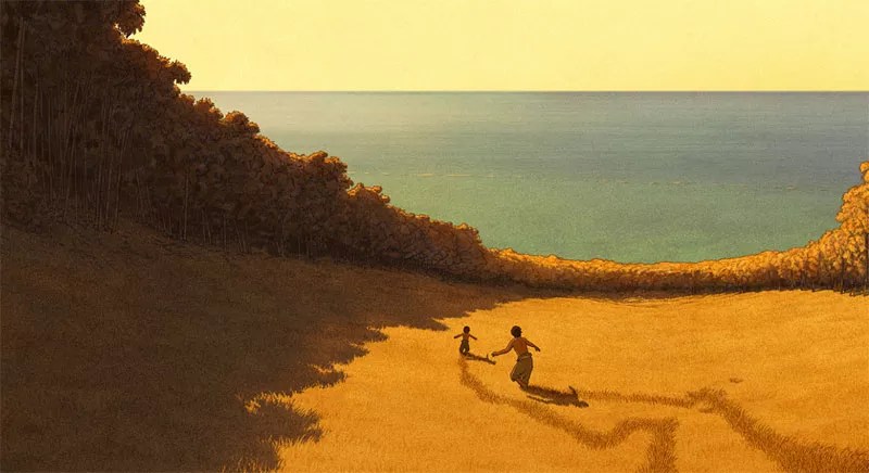 The simple story told in the near-wordless animated feature film The Red Turtle is almost biblical. Without any backstory, it opens with a speck of a man bobbing in a great watery expanse, buffeted by the waves of a storm-ravaged ocean that almost swallow him whole. Washed ashore on a deserted tropical island, the bedraggled castaway forages for food; his only companions are the scurrying crabs that shadow his every move on a lonely beach. Using bamboo cut from the island’s interior, he builds a large raft and sets sail for an unknown destination, but the voyage is quickly thwarted by an unseen being that destroys his makeshift vessel, shattering it to pieces. A second attempt ends similarly, but on the third unsuccessful try, he finally comes eye to eye with the creature that keeps sabotaging his departure, a giant sea tortoise with a scarlet-hued shell, a majestic tortue rouge. The connection between them is fleeting, but powerful. Back on the island, the frustrated man sees his mystical adversary come ashore and vengefully flips it on its back, leaving it to die in the blazing sun. But like Botticelli’s Venus sprung from a half-shell, a beautiful copper-haired woman later emerges from the split casing of the dead terrapin. She becomes his Eve, and the remainder of The Red Turtle recounts their years together on their secluded Eden. Who knows what it all means, or whether it’s intended to mean anything it all. But it sounds like something from an ancient myth, doesn’t it?